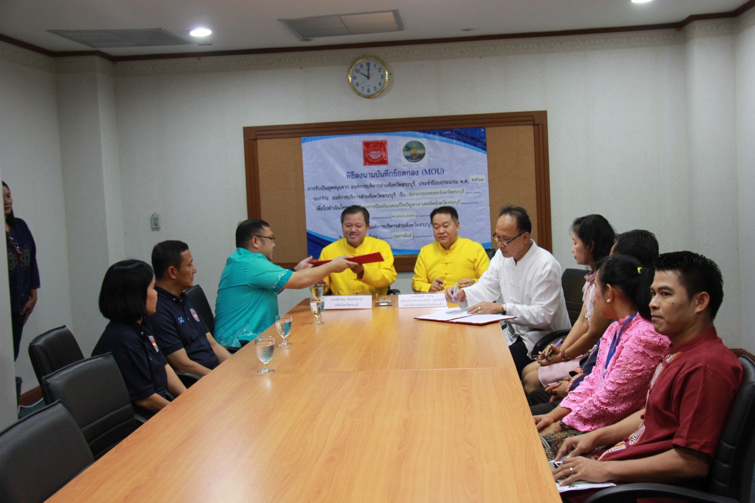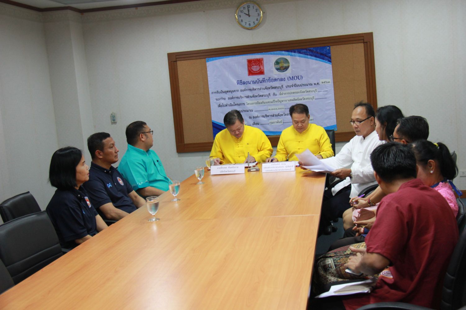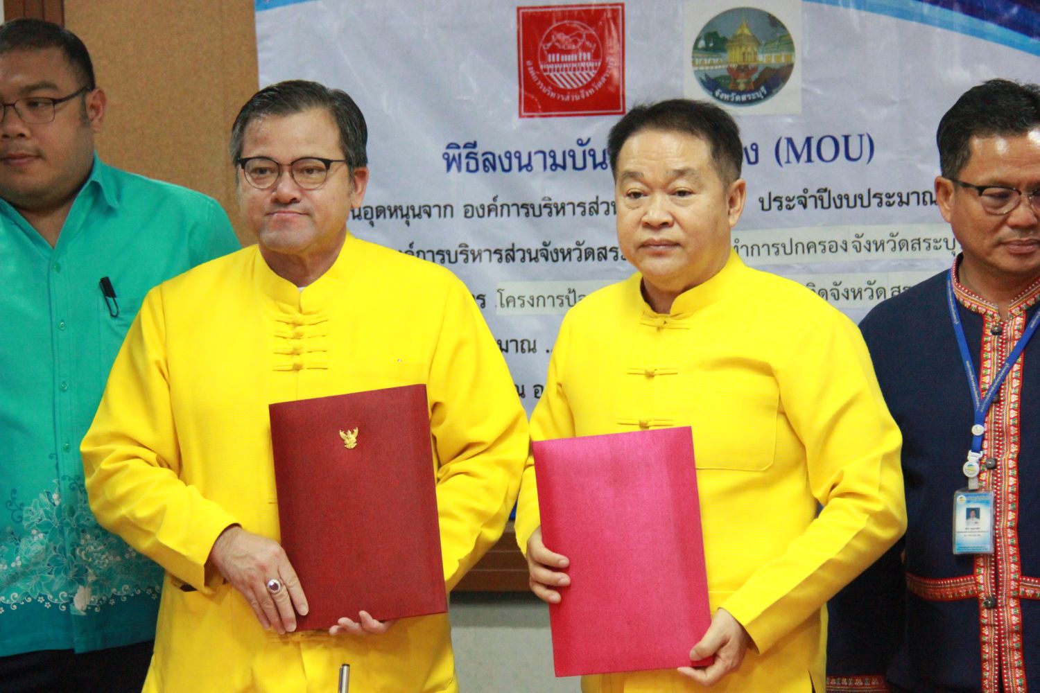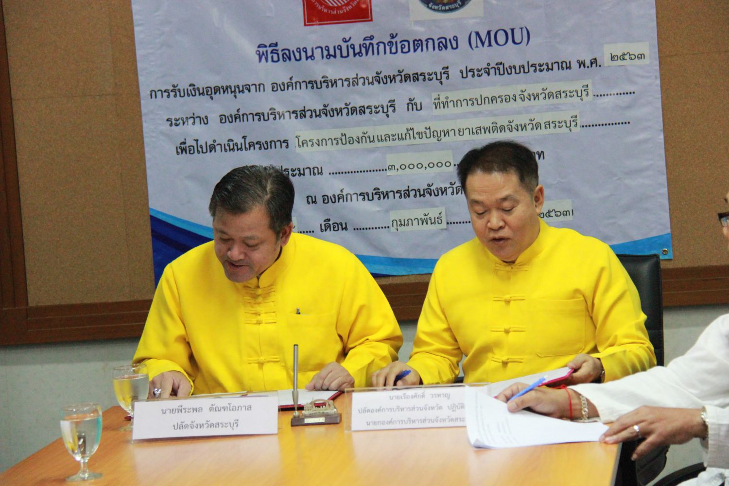 นายเรืองศักดิ์ วรหาญ ปลัดองค์การบริหารส่วนจังหวัด ปฏิบัติหน้าที่ นายกองค์การบริหารส่วนจังหวัดสระบุรี และ นายพีระพล ตัณฑโอภาส ปลัดจังหวัดสระบุรี ลงนามในบันทึกข้อตกลง (MOU) โครงการป้องกันและแก้ไขปัญหายาเสพติดจังหวัดสระบุรี ประจำปีงบประมาณ พ.ศ. 2563 ในวันอังคารที่ 4 กุมภาพันธ์ 2563 ณ ห้องประชุมย่อย 2 องค์การบริหารส่วนจังหวัดสระบุรี