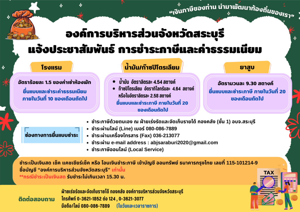 - ประกาศการยื่นแบบชำระภาษีและค่าธรรมเนียมบำรุงองค์การบริหารส่วนจังหวัดสระบุรี